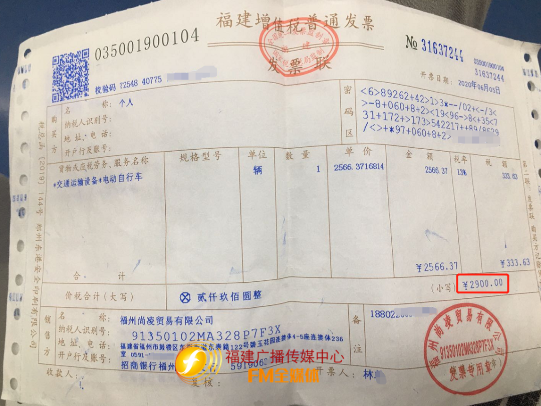 FM全媒体记者发现,两张发票均没有标注电动车的品牌和型号,仅粗略的写“交通运输设备、电动车”。记者询问另一家门店,对方查询后表示,新大洲这款“易骑换电”的电动车,售价为3600元左右(含锂电池)。