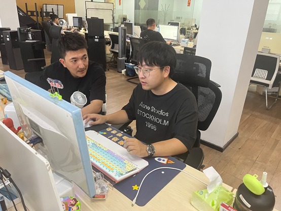 胡茂前(左)为公司年轻员工搭建了相对完善的培养体系,希望大家都能自己当“老板”。张子琪|摄