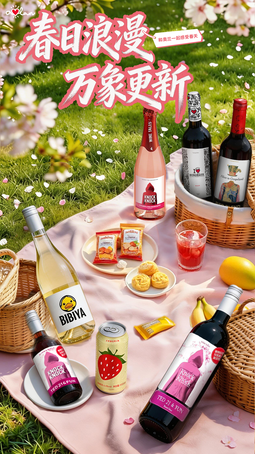 本次联动,奥兰酒业围绕春日消费需求,全面上线旗下核心明星产品矩阵,包括奥兰小红帽系列、BIBIYA 小黄鸭系列、桑格利亚果味气泡酒等多款兼具颜值与口感的爆款单品。产品在风味、包装与饮用场景上深度贴合樱花季、闺蜜聚会、户外野餐、居家小酌等春日氛围,以低度、清爽、易饮的特点精准击中年轻消费者偏好。