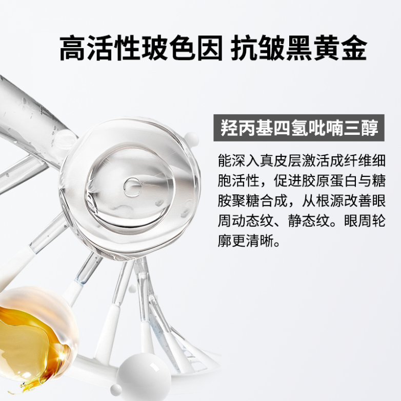 紧致抗皱、狠消眼袋,全靠核心成分羟丙基四氢吡喃三醇(玻色因) 强势坐镇,高活性成分深透眼周肌底,唤醒沉睡胶原,提拉松弛轮廓,收紧膨出眼袋,抚平顽固干纹,让松垮下垂的眼周瞬间回弹紧致,从根源瓦解眼袋困扰;搭配可溶性胶原,直补肌底流失养分,充盈肌肤沟壑,强化眼周弹性,让泡泡眼快速扁平,眼周愈用愈平整。