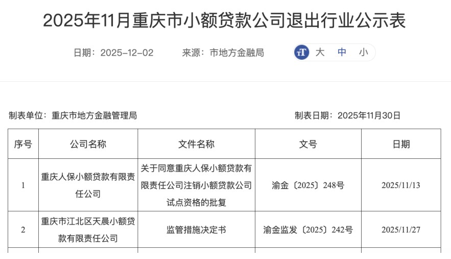 消费日报网讯(记者 卢岳)12月2日,重庆市金融监管局发布的《2025年11月重庆市小额贷款公司退出行业公示表》显示,包括重庆人保小额贷款有限责任公司(简称“人保小贷”)在内的21家小额贷款公司退出行业,不得再从事小额贷款相关业务。