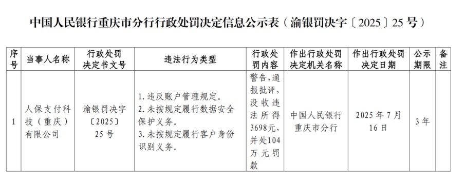央行官网信息显示,今年7月,中国人民银行重庆市分行对人保支付下发一张罚单。罚单显示,人保支付存在以下违规行为:1.违反账户管理规定;2.未按规定履行数据安全保护义务;3.未按规定履行客户身份识别义务。人保支付因此被警告,通报批评,没收违法所得3698元,并罚款104万元。