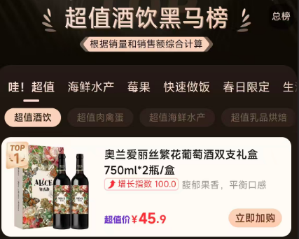 此次登顶朴朴黑马榜的爱丽丝繁花双支礼盒,定价仅45.9元,折合单瓶不到23元,却拥有西班牙进口品质、平衡果香口感与高颜值礼盒包装,精准击中即时零售用户“便宜、好喝、方便、有面”的核心需求。