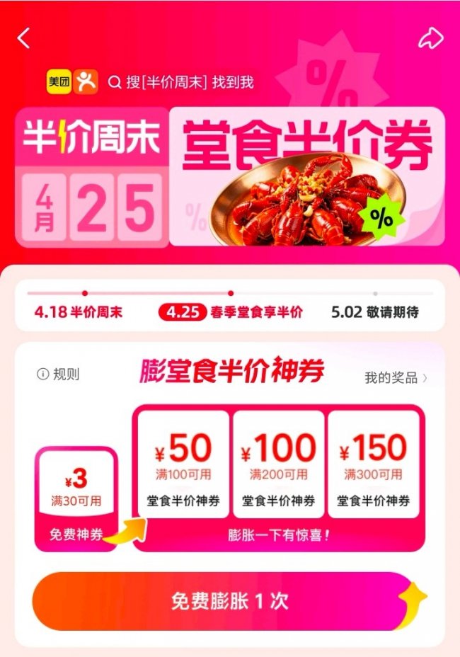ÖÜÄ©£¬²»Ö»ÊÇÈÕÀúÉϵÄÁ½ÌìÐÝÏ¢£¬¸üÊdzÇÊÐÉÌÒµÂö²«Ìø¶¯×îÇ¿µÄʱ¿Ì¡£¶ÔÓÚ²ÍÒûÉ̼ҶøÑÔ£¬ÖÜÄ©ÌÃʳµÄ¿ÍÁ÷Óë·Ì¨ÂÊ£¬ÍùÍù¾ö¶¨ÁËÒ»ÖܵÄÓªÊÕµ×É«¡£È»¶ø£¬Ïû·ÑÕßÓÌÔ¥²»¾ö¡¢Ô¤ËãÃô¸Ð£¬³£³£ÈÃÕâ·Ý“ÖÜÄ©ºìÀû”´òÁËÕÛ¿Û¡£ÈçºÎÈÃÖÜÄ©¾Û²Í´Ó“¿ÉÑ¡Ïî”±ä³É“±ØÑ¡Ï¿´ð°¸²ØÔÚÃÀÍÅ¡¢´óÖÚµãÆÀÓÚ4ÔÂ25ÈÕ¿ªÆôµÄ"´ºÄ©ÏÞ¶¨"Ö÷Ìâ»î¶¯Àï¡£Ïû·ÑÕßͨ¹ýÃÀÍÅApp¡¢´óÖÚµãÆÀËÑË÷“°ë¼ÛÖÜÄ©”¼´¿É½øÈë»î¶¯Ò³Ã棬×î¸ß¿É»ñÈ¡300-150Ôª°ë¼ÛÉñȯ¡£¸Ã»î¶¯³ÖÐøÎȶ¨Êä³ö°ë¼ÛÓŻݣ¬ÈÃÖÜÄ©¾Û²Í¼ÈÄÜÏíÊ܏߯·ÖÊÃÀʳ£¬ÓÖÄܺÏÀí¿ØÖÆÏû·ÑÔ¤Ëã¡£