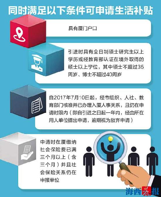 海西晨报讯(记者刘宇瀚)去年7月,厦门市委、市政府出台《关于深化人才发展体制机制改革加快推进人才强市战略的意见》中,提出了颇具吸引力的新引进人才生活补贴政策。对符合条件的硕士研究生以上学历人员及归国留学人员,一次性给予每人最高5万元的生活补贴。