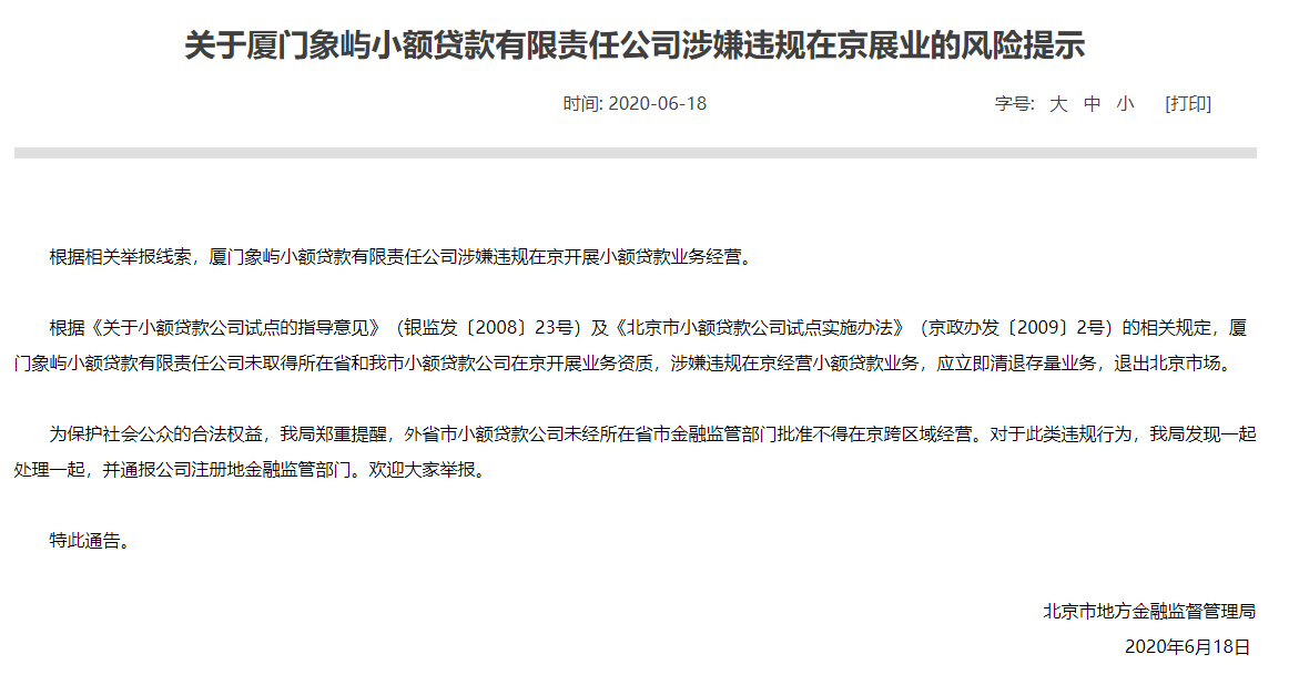 6月18日,北京金融监管局官网显示,根据相关举报线索,厦门象屿小额贷款有限责任公司涉嫌在京违规展业。按照相关规定,北京金融监管局要求象屿小贷立即清退存量业务,退出北京市场。