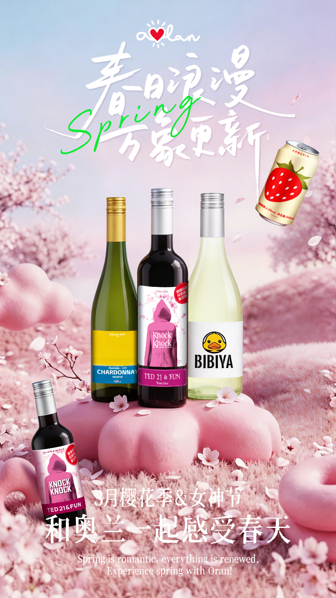 本次联动,奥兰酒业围绕春日消费需求,全面上线旗下核心明星产品矩阵,包括奥兰小红帽系列、BIBIYA 小黄鸭系列、桑格利亚果味气泡酒等多款兼具颜值与口感的爆款单品。产品在风味、包装与饮用场景上深度贴合樱花季、闺蜜聚会、户外野餐、居家小酌等春日氛围,以低度、清爽、易饮的特点精准击中年轻消费者偏好。