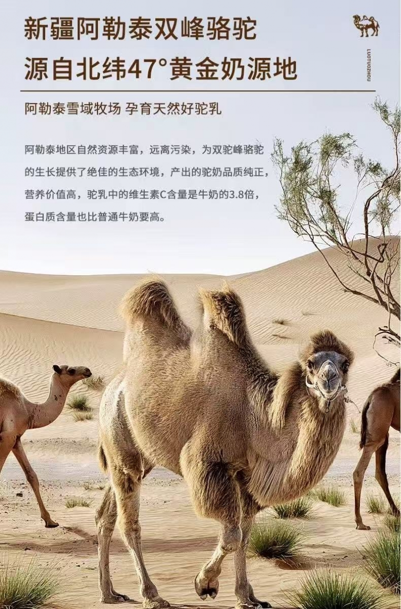 一款驼奶粉的品质,从奶源地便已注定。骆驼洲有机驼奶粉作为拥有自有牧场+规模化养殖的实力品牌,将奶源地选址于新疆阿勒泰北纬47°黄金奶源带——这片被誉为“中国有机驼奶核心产区”的土地,自然资源优渥,远离工业区,无污染。阿尔泰山冰川融水滋养草原,土壤纯净,独特气候使沙生植物积累丰富营养,为双峰驼提供优质食料;冬季严寒抑制病菌,驼群在原生态环境生长。品牌有超6600亩专属有机生态牧场,采用半野生散养模式,严控养殖密度,存栏双峰骆驼1800峰,年产能约480吨。成熟养殖规模与科学管理模式,实现从牧场到餐桌全链路把控,锁住驼奶纯净与营养活性。