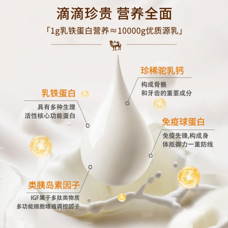 2. 蛋白质和钙含量与质量:优质驼奶粉蛋白质含量达27%以上,这是营养密度核心指标;关注钙含量,每100克驼奶粉钙含量达1000mg以上,实现高效补钙,提供营养支撑。