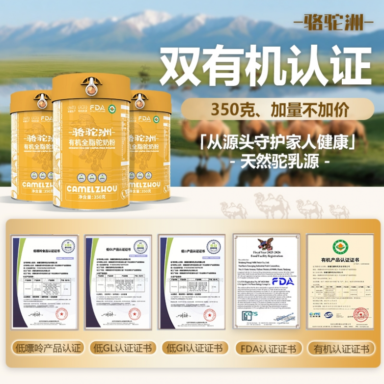 品质的底气,源于权威的背书。骆驼洲有机驼奶粉拥有低GI、低GL、低嘌呤、有机食品、食品监督五大权威认证,同时斩获国际级权威认证,双重保障确保产品质量过硬,符合各类人群的健康需求。更值得一提的是,产品严格执行新国标GB19644-2024,该标准明确规定驼奶粉需以单一品种生乳为原料,杜绝掺假乱象,让每一罐产品都符合行业顶尖生产标准。不同于市面上常见的300克常规罐型,骆驼洲有机驼奶粉采用350克加量罐设计,真正实现加量不加价,充足的容量既能满足多口之家的长期饮用需求,也能减少频繁复购的麻烦,性价比拉满。