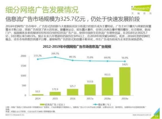 来自艾瑞咨询的一份报告显示,信息流广告在2016年的产值达到328.7亿人民币,同比增速超过89.5%,这将带来原生内容商业转型的巨大窗口,而短视频则是最重要的受益方之一。